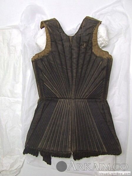 Стёганная одежда ( гамбезон) около 1450года . Было найдено 3 подобных одеяния. Одно имело отделку мехом в нижней части , но из-за перевозок между музеями во время второй мировой войны меховая часть была утеряна и осталось только чёрно-белое довоенное фото . (Arming jacket, 1440-60, Holstentor Museum, Lübeck) (фото 3)