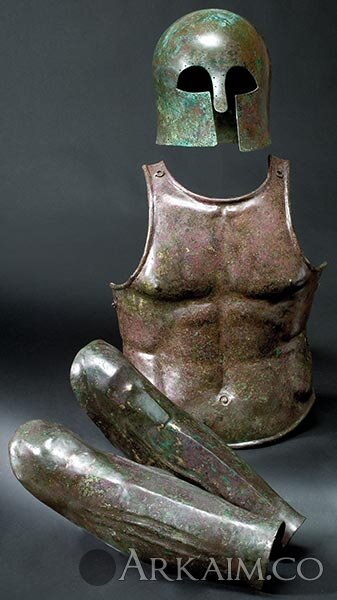 Греческий набор доспехов: шлем коринфский, 7-ой век до н.э., нагрудник, 5 века до н.э. и поножи, 5 век до н.э.