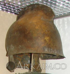 Греческий шлем фракийского типа, 450-400 гг. до н.э. Найден на озере Copais в Беотии. По краю буквы HIARO, что означает "священное", возможно часть жертвоприношения. Британский музей