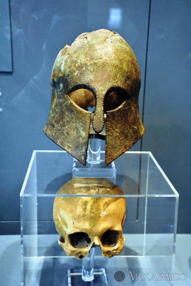 Коринфский шлем и череп из него, 6 в. до н.э. Королевский музей в Онтарио, Канада