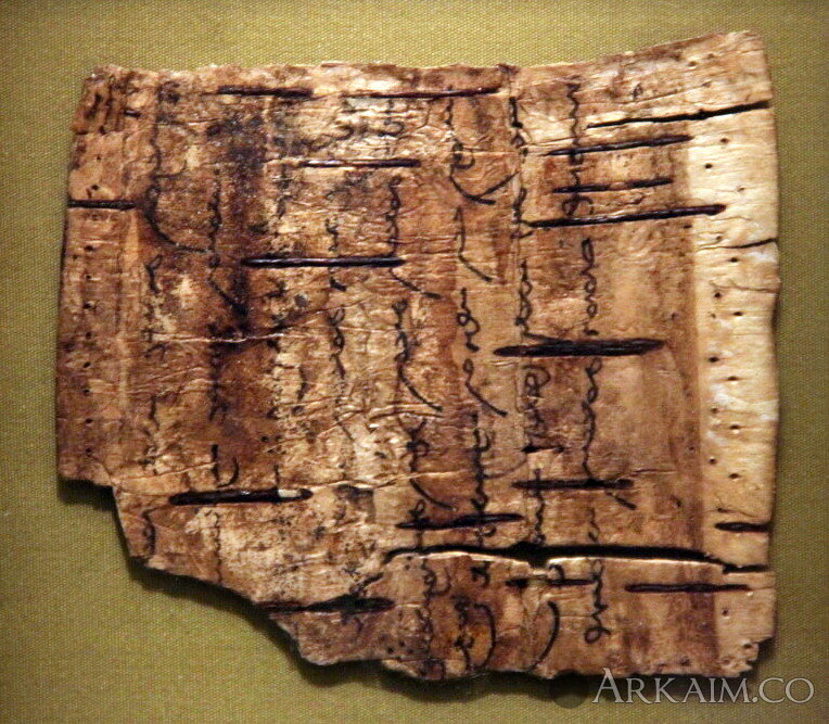 Фрагмент рукописи на бересте. Ордынский город Укек, ныне Саратов. Золотая Орда XIV в.
