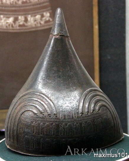 Бронзовый шлем Урарту царя Сардури II (764—735 гг. до н. э.) с дарственной надписью "Богу Халди, владыке, этот шлем Сардури, сын Аргишти подарил". Музей Эребуни, Ереван, Армения (фото 1)