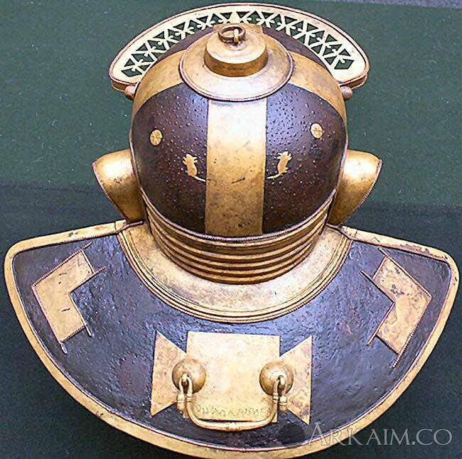 Железный римский шлем с бронзовыми пластинами и декором. По утверждению, шлем с Балканского региона (из реки). Чёрный цвет шлема не является его оригинальной особенностью, это лишь обработка материала для его сохранения. Вес: 1,73 кг