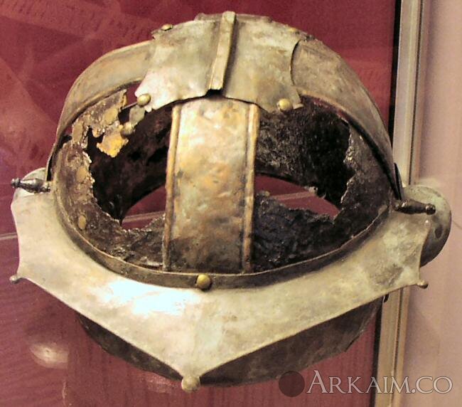 Римский шлем из музея Wijk bij Duurstede, Нидерланды. Купол шлема железный, две верхние пластины крестом и декоративные элементы - из медного сплава. Тип: Imperial Italic H, предположительно 3 в. н.э. (фото 1)