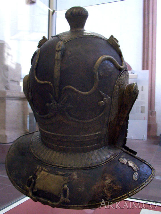 Железный шлем с бронзовыми украшениями (змеи). Найден в 1883 г. и лишь недавно восстановленный, в Heddernheim недалеко от Франкфурта, Германия.