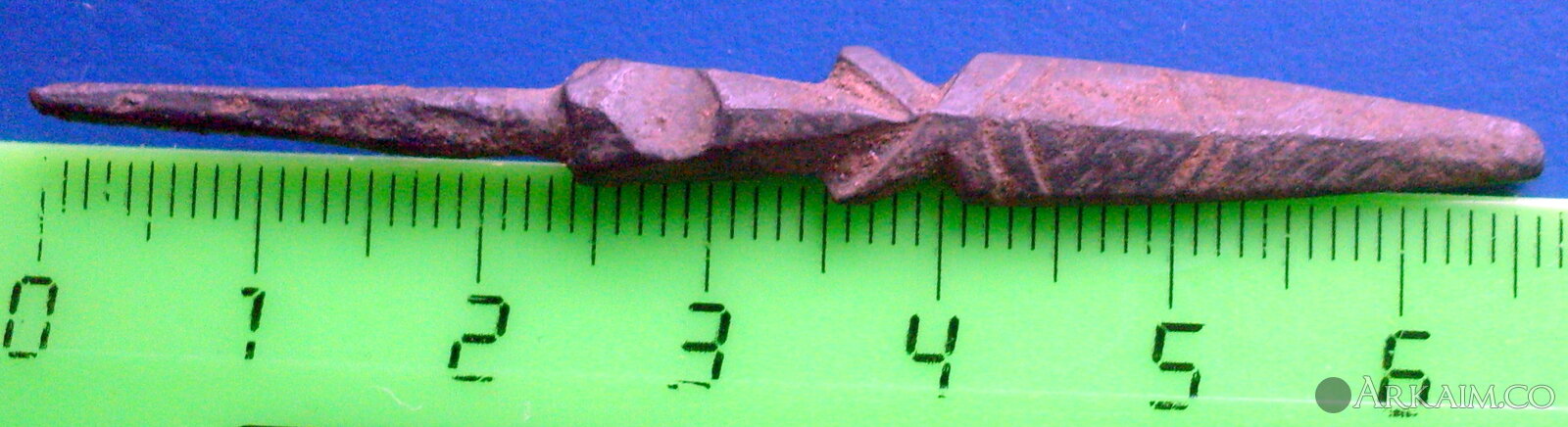 Наконечник стрелы с ромбической головкой орнаментированной полосами с отходящими шипами в месте перехода в цилиндрическую шейку, тип не описан, 14-15 вв.?