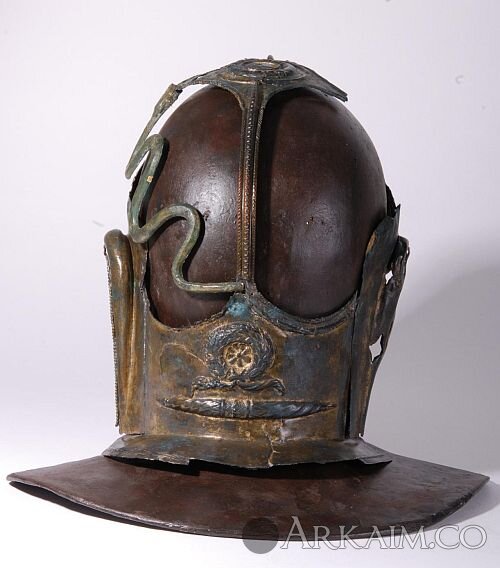 Шлем с бронзовыми накладками и украшениями в виде двух змей и двух медальонов закрученной формы. Был найден в Торсбергском болоте, Schleswig-Holstein (север Германии, рядом с границей Дании), в самой Ютландии - куда не заходили римские части, и как он туда попал неизвестно.
