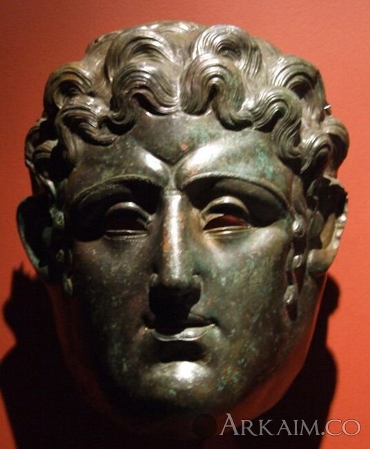 Одна из пяти бронзовых римских масок, найденных в 3 км от крепости города Straubing в 1950 г.