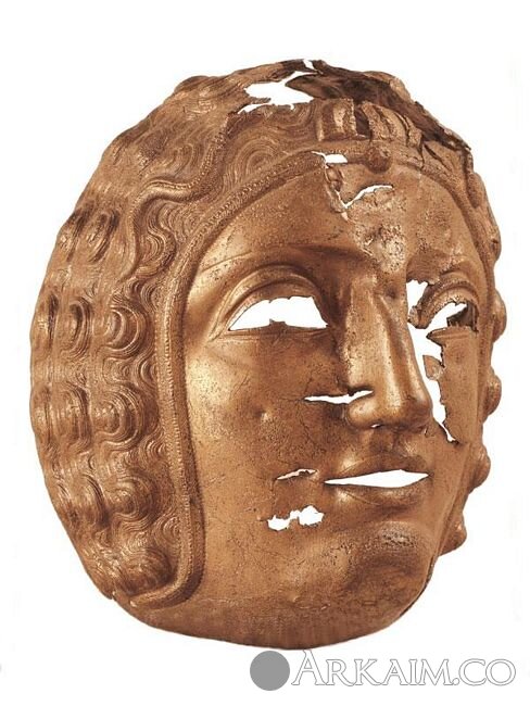 Женская маска из медных сплавов, представленная в городе Lovec, Болгария. Место нахождения неизвестно. В волосах есть две змеи, возможно волны волос так же представляют собой змей, а сама маска и вовсе голову Медузы. Над центром бровей есть выпуклость похожая на шлем.