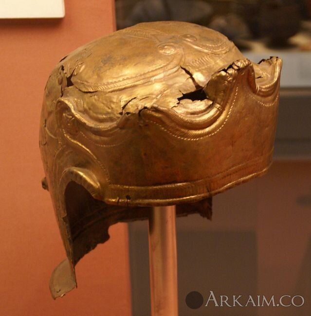 Бронзовый шлем найден в Guisborough, Yorkshire, Британия. Спереди три вершины, изображающие корону, под ними изображены две змеи, встречающиеся головами в центре. У короны есть отверстия под украшения, а по бокам, ниже ушей шлема, имеются заклёпки для крепления нащёчных пластин.