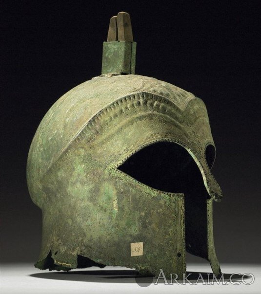 Коринфский шлем с остатками держателя для гребня, 600-550 гг. до н.э. Найден в Руво в Италии. В настоящее время в коллекции Британского музея.