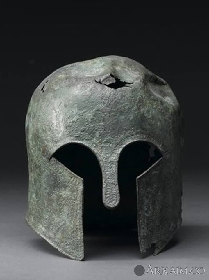 Коринфский шлем, около 650-550 гг. до н.э., найден в 1870 году на берегу Эврип в Греции. Коллекция Мемориального музея в Эксетере, графство Девон