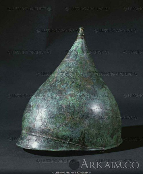 Конический бронзовый шлем с козырьком, из гробницы 44/2 в могильника Duerrnberg горы, Hallein, Австрия. Высота 30 см