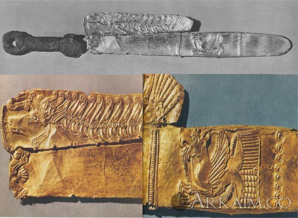 Скифский акинак в ножнах наложенным золотым рельефом, 44 см длиной. 4 в. до н.э. с. Елизаветовское, дельта Дона, Ростовская обл.