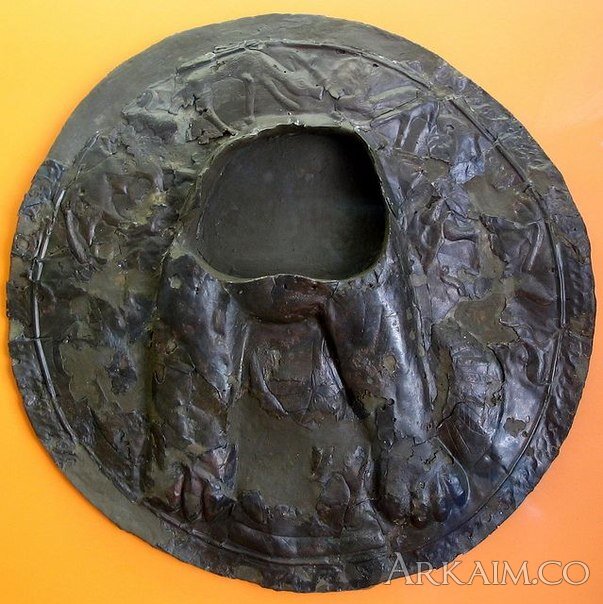 Щит с изображением львицы в окружении овнов из святилища Аполлона в Дельфах, бронза, пп. 7 в. до н.э. Археологический музей, Дельфы, Греция