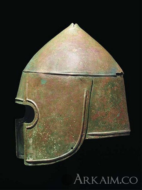 Yorik 88 Опубликовано 29 января, 2016 В музее Аргоса (Греция) хранится шлем конического типа, собранный из нескольких частей. У него заостренная макушка, увенчанная высоким металлическим гребнем в виде дуги. Шлем найден в захоронении VIII в. до н. э. на Пелопоннесе. Такой характерный гребень часто изображался на шлемах ассирийских воинов на барельефах того времени. Форма гребня косвенно указывает на источник возрождения кузнечного ремесла в Элладе. Нижняя часть шлема практически не отличается от форм более позднего иллирийского типа. К VII в. до н. э. бронзовый гребень исчез, как исчезла и восточная конусовидность шлема.