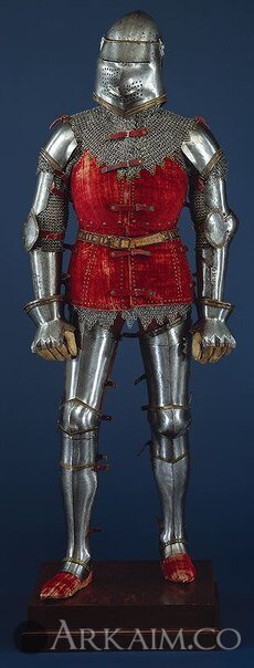 Эта броня была восстановлена и собрана в ее нынешнем виде примерно в 1920 и состоит в основном из частей уникального клада брони, обнаруженного в 1840 году на руинах венецианской крепости на Греческом острове Эвбея ... бархат был добавлен в процессе восстановления брони.