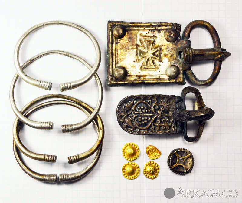 Клад готский, серебро,золото,бронза. Вес серебрянных браслетов 88,09 грамм. Вес бляшек нашивных золотых 0,70 грамма. На пряжке с крестом язычёк подвижный,на пряжке поменьше - неподвижный. Крупная пряжка - серебро с бронзовой подкладкой.Пряжка поменьше - оловянистая бронза.Накладка - материал серебро? Житомирская обл.