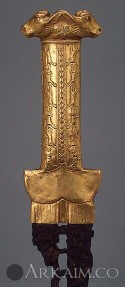 Рукоять акинака, железо, золото, 14.9; 5,5 см , 5 в. до н.э. Чертомлык Барроу, возле Никопольского. Источник поступления в музей: Императорской Археологической комиссии, Санкт-Петербурге.