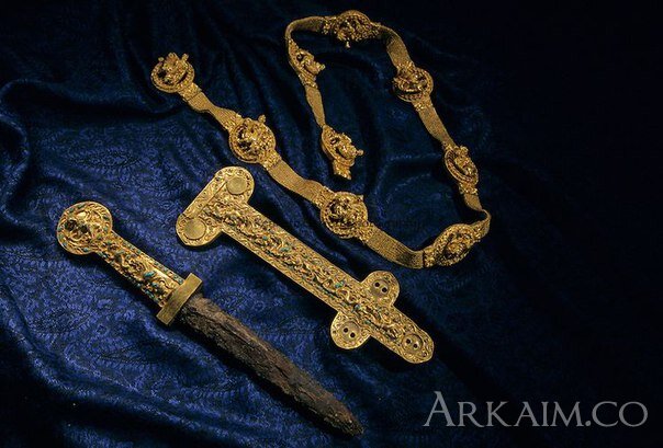Кинжал, ножны, и пояс воина, золотые артефакты из Тилля-Тепе, захоронение 4, найден в гробнице бактрийских кочевников.