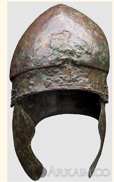 Тяжёлый бронзовый шлем, 5-4 вв. до н.э. Высота 21,5 см. Вес 1523 гр. Красновато-коричневый налет, с зеленью. Стабилизированный внутри стекловолокном и смолой.Коллекция Акселя Гуттманна. Приобретен в 1989 году в Крефельде (фото 1)