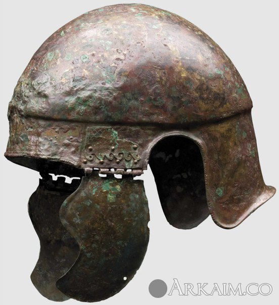 Тяжёлый бронзовый шлем, 5-4 вв. до н.э. Высота 21,5 см. Вес 1523 гр. Красновато-коричневый налет, с зеленью. Стабилизированный внутри стекловолокном и смолой.Коллекция Акселя Гуттманна. Приобретен в 1989 году в Крефельде (фото 2)