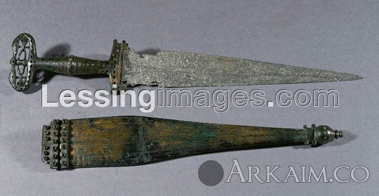 Кинжал биметаллический (рукоять из бронзы с костяными вставками). Ножны бронзовые. Размеры: кинжал 34,7 см, ножны 28,2 см. Некрополь в Гальштате, Австрия, Могила 116. Музей естественной истории, Вена, Австрия