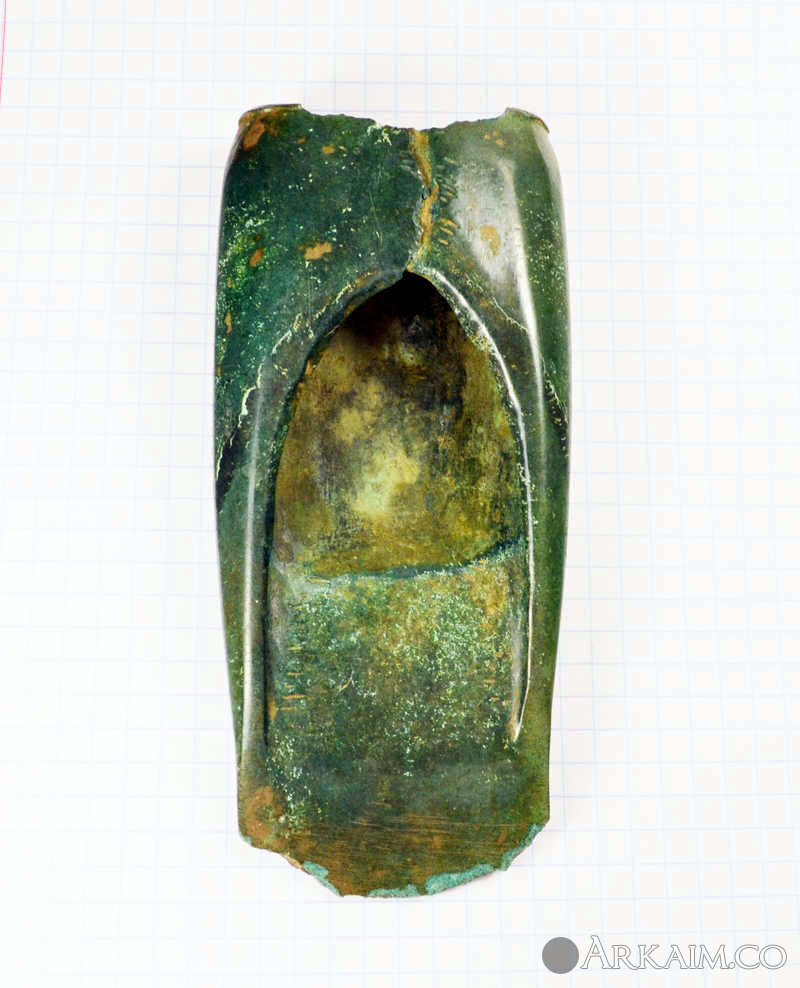 Мотыга со свернутой втулкой, ранняя/средняя бронза. Длина топора 12 см,ширина топора 5 см,ширина лезвия топора 4,5 см. Вес приблизительно один кг. Житомирская обл.