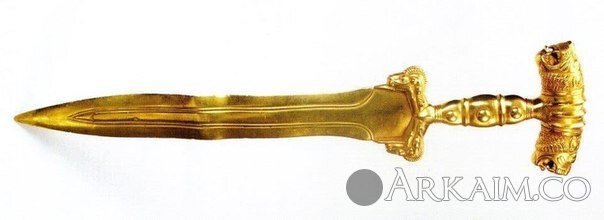 Золотой кинжал ахеменидов с рукоятью обрамлённой головами львов. Национальный музей Ирана (фото 1)