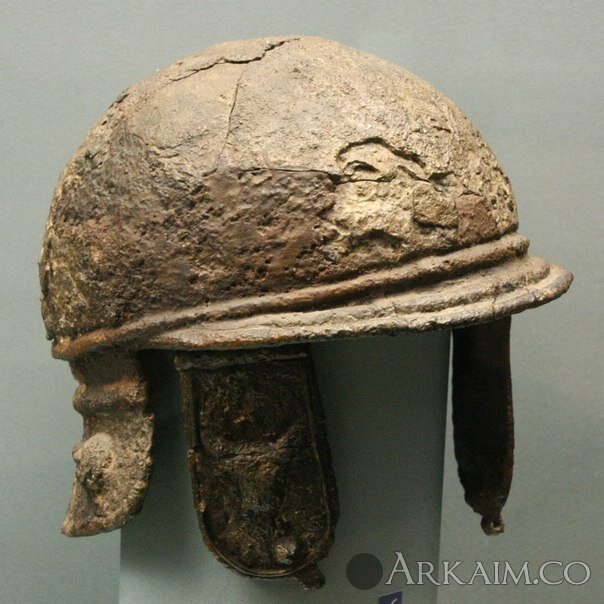 Кельтский шлем из погребения 3 кургана у хутора Бойко-Понура, украшенный человеческими личинами и головками быков. Железо. Первая половина II в. до н.э.