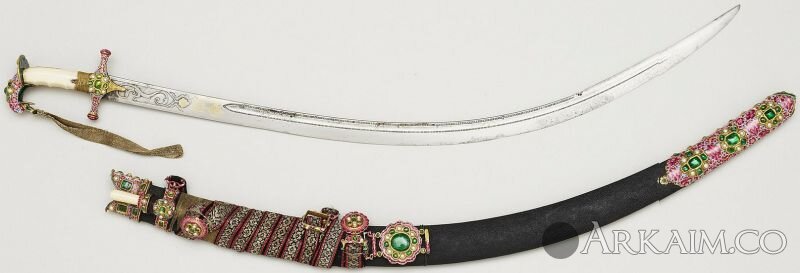 Шемшир из Персии (около 1800 г.), но вполне мог использоваться и в Индии, тем более что сделан он из индийского булата. Совершенно роскошная вещь: у клинка в прорези вставлены мелкие жемчужины, отделка произведена эмалью, золотом, изумрудами, «рыбьей кожей», рукоять из слоновой кости.