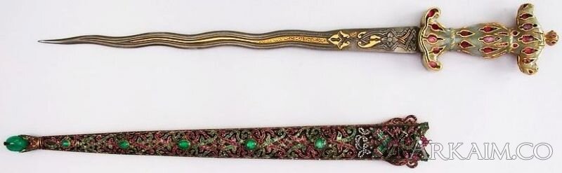 Турецкий синжал с «пламенеющим клинком» в стиле малайского криса и рукоятью из оникса декорированной золотом и рубинами. Ножны украшает серебряная скань и крупные изумруды. XIX в. Длина 56.5 см. Общий вес 396.9 гр.