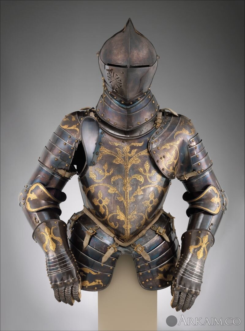 Один из двенадцати турнирных полудоспехов, которые были заказаны в подарок саксонскому курфюрсту Кристиану I его супругой Софией Бранденбургской из рода Гогенцоллернов. Доспех сделан из оксидированной стали, украшен методом травления по металлу и покрыт позолотой. Вытравленный рисунок состоит из больших растительных узоров, завивающихся от центрального ствола, с вытравленными линиями и с позолоченным узором из листьев внутри.