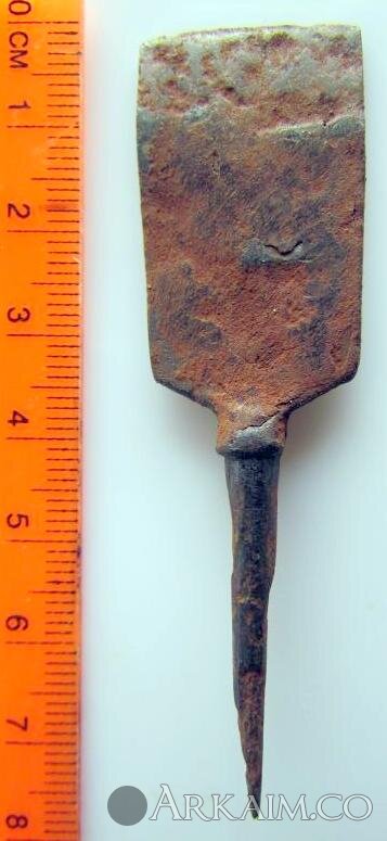 Срезень в виде узкой прямоугольной лопаточки с упором, тип 57 по Медведеву, 8-10 вв.