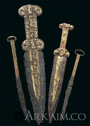 Скифские железные акинаки и ножи с золотым напылением. 6-5 век до н.э. из кургана Аржан - 2, скифский царский некрополь в Туве, Южная Сибирь