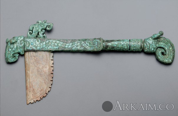Топор с драконами, бронза с бирюзовой инкрустацией и нефрит, 1300-1200 гг. до н.э., династия Шан. Анян, Китай.