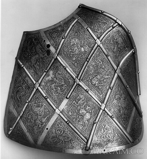 Плечевой турнирный щит, служащий мишенью для попадания копьем, 1550-1560 гг. Аугсбург, Германия. Метрополитен-музей, Нью-Йорк