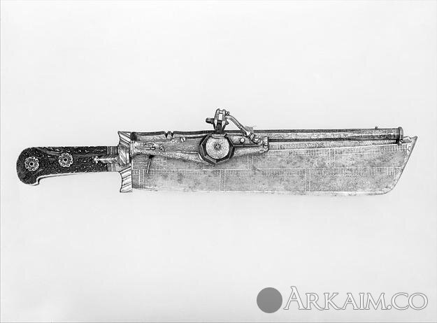 Комбинированный охотничий нож с колесцовым пистолетоми календарем на 1529-1534 гг., изготовлен 1528-1529 гг. Мюнхен, Германия. Метрополитен-музей, Нью-Йорк