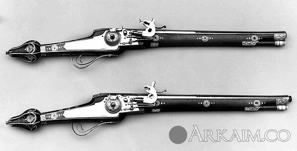 Пара пестолей с колесцовыми замками сделанных для телохранителей курфюрста Саксонии. Изготовил Simon Helbig (1609–1642), 1610 г. Дрезден, Германия. Метрополитен-музей, Нью-Йорк
