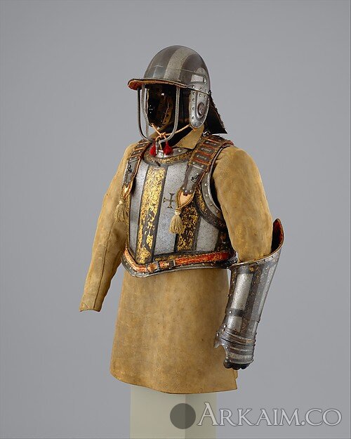 Аркибузерский доспех Педро II, короля Португалии (правил 1683-1706), изготовил Ричард Холден (1658-1708), нащечники и наплечники изготовил Даниэль Тачаукс (французский реставратор, 1857-1928) в музее Метрополитен, датируется после 1683 г. (поддоспешник изготовили в 17-18 вв.). Англия. Метрополитен-музей, Нью-Йорк