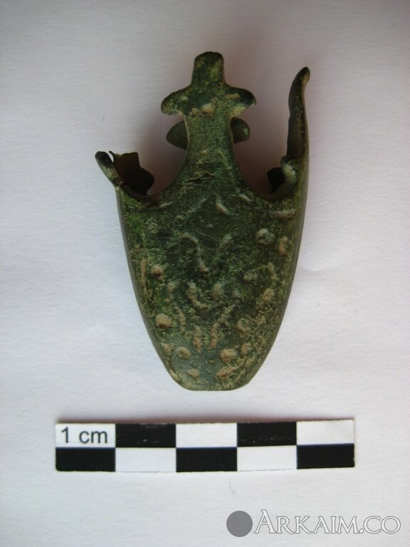 Бутероль от ножен меча куршско-восточнопрусской группы, тип V:2с (с крестами и усиками). Датировка: 11-13 вв. В Беларуси как правило - конец 12-13 вв. (в некоторых случаях возможно доживают до первой половины 14 в.) Один из самых распространенных типов. Найден в Новогрудском районе.