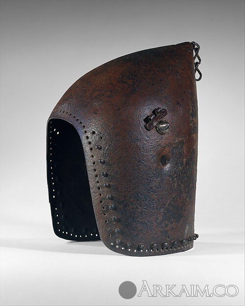 Согласно атрибуции известной только с девятнадцатого века, этот шлем носила в бою Жанна д'Арк (1412-1431) и был дан ей в церкви Saint Pierre du Martroi в Орлеане, где он висел над главным алтарем. Хотя легенда, вероятно, не соответствует действительности, шлем имеет то, что выглядит как ущерб от использования в бою.следы от использования в бою.