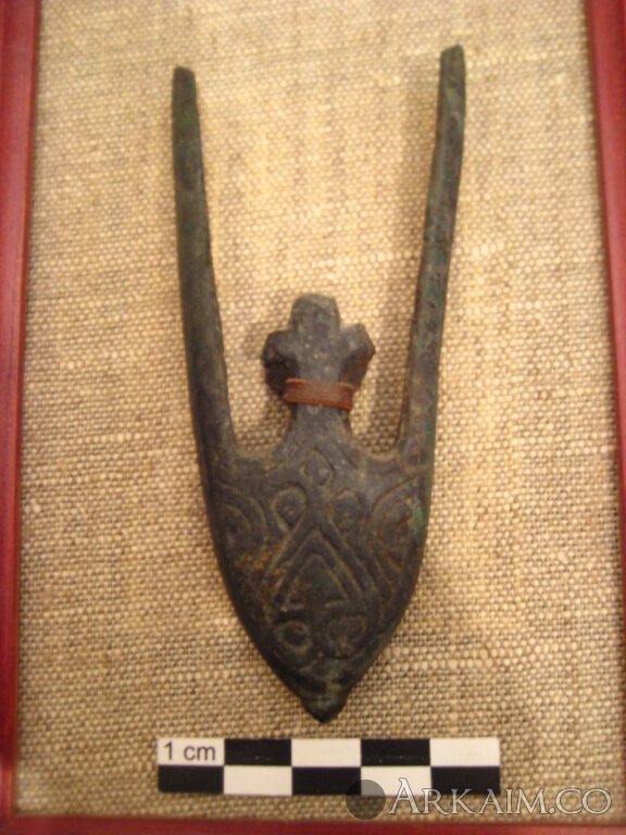Бутероль от меча куршско-восточнопрусской группы "с крестами и усиками", тип V:2а. В центре - трехлистная пальметта. По датировке - общепринятая датировка - 11-13 вв., с территории Беларуси возможно датируются 13-нач. 14 вв. Место находки - Гродненская область.