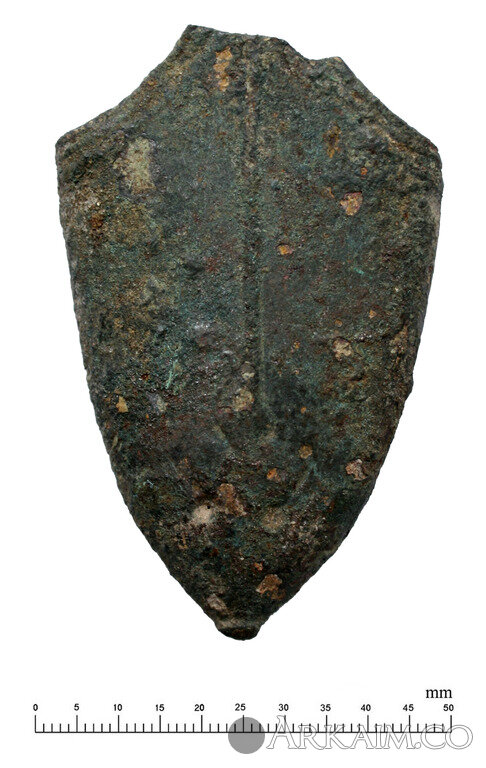 Непрорезной наконечник ножен меча с трилистником в основании, переходящим в вертикальное ребро. По типологии П.Паульсена данный тип наконечников относится к "восточно-прусской" группе. Датировка - конец 10 - 11 вв. Место находки - Гомельская область, Рогачёвский район.
