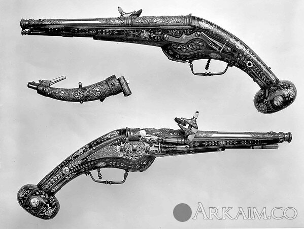 Пистоли с колесцовыми замками и пороховница, ок. 1570-1580 гг. Франция. Метрополитен-музей, Нью-Йорк