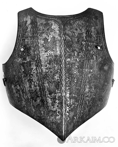 Символы глубоко выгравированы на посеребренной поверхности стали этого нагрудника включают пентаграмму, буква F, и диадему, опоясывающую пару скрещенных пальмовых ветвей. Это личные эмблемы испанского дворянина Дон Гомес Суарес де Фигероа Кордова, герцога Фериа (1587-1634), видного военачальника на службе короля Филиппа III. С 1618 до 1625 и снова с 1631 по 1633, он занимал престижную должность губернатора герцогства Милан.