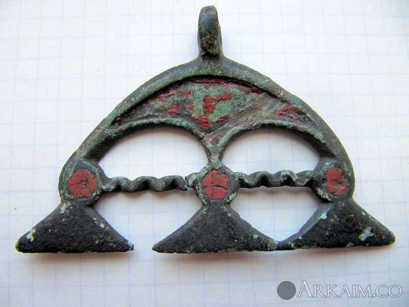 Привеска-лунница , Киевская культура, III-IVвв, бронза, литье, выемчатая эмаль(красный). Относится к типу I по Корзухиной Г.Ф.(большие лунницы). Возможно, служила центром композиции в цепи.Черниговская обл.