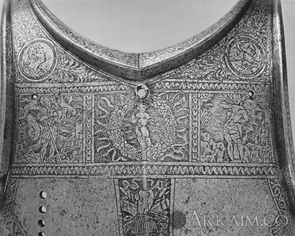 Прекрасный пример самого высокого качества травления на итальянской броне в конце пятнадцатого и начале шестнадцатого веков. Характерны центральная полоса с классическими трофеями и горизонтальный фриз с изображением святых. Здесь, Младенец Христос как Salvator Mundi (Спаситель Мира) появляется в центре, в окружении Святого Христофора и Святого Себастьяна.