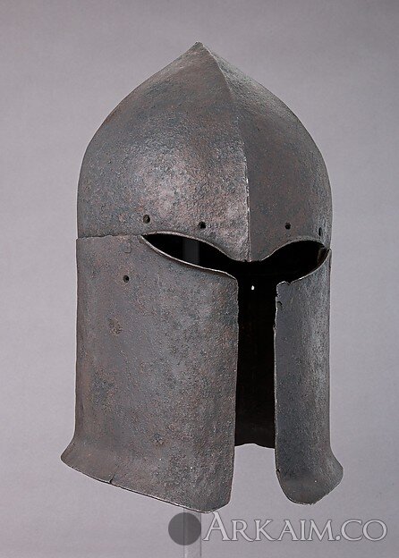Вероятно является прообразом шлемов типа барбют, которые делались цельнокованными и появились в Италии в 1440 гг.