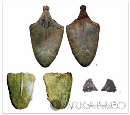 Непрорезные наконечники ножен меча с трилистником в основании (пальметтой), переходящим в вертикальное ребро. По типологии П.Паульсена данный тип наконечников относится к "восточно-прусской" группе. Датировка - конец 10 - 11 вв.